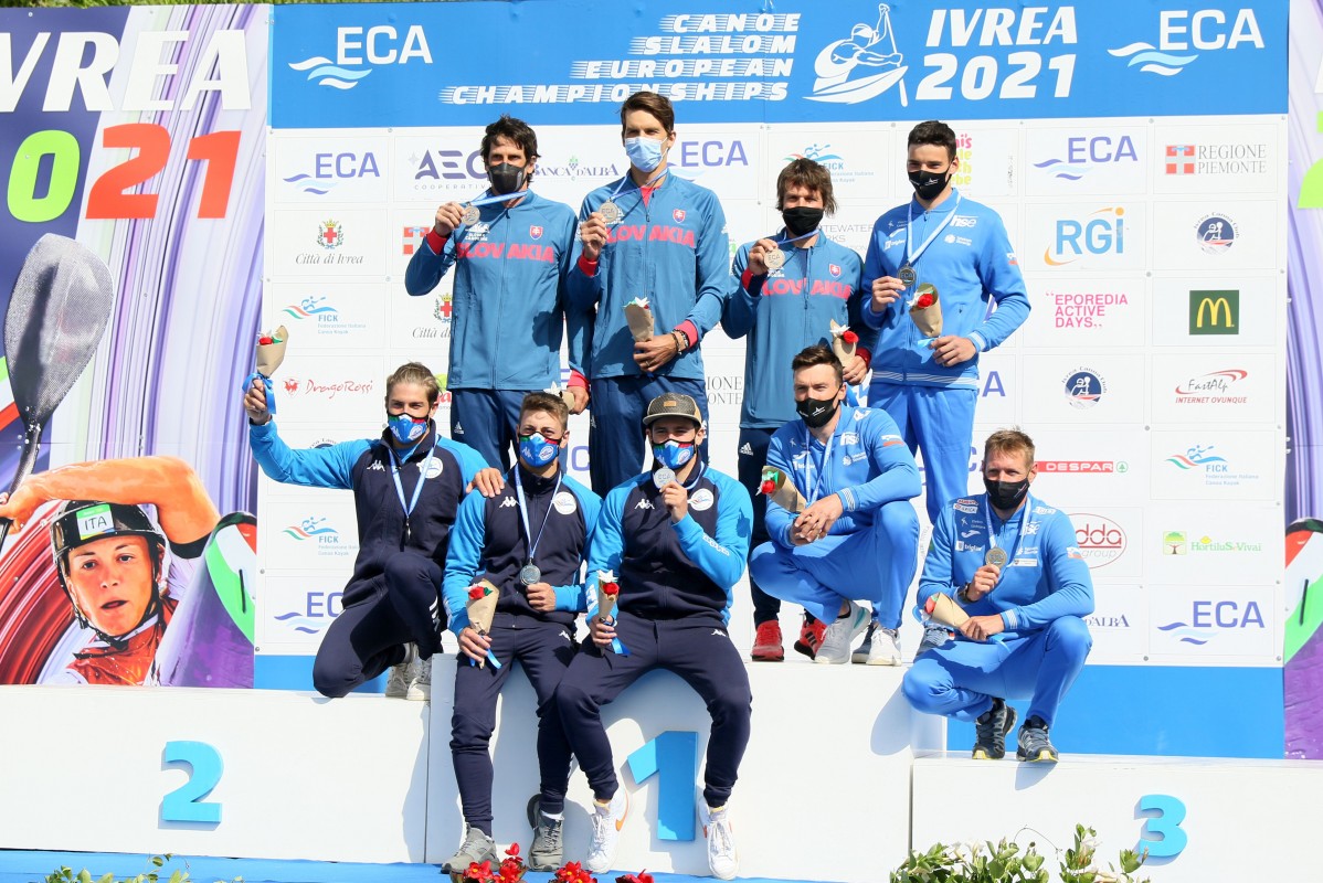 The same as their team colleagues in women's canoe Slovak canoeists Michal Martikan, Alexander Slafkovsky and Matej Benuš produced a clean run to claim the European Champion title. This was their 12th men's C1 team event gold. Legendary Michal Martikan was a team member on all twelve occasions. The two Slovak teams were actually the only two teams of the whole competition who had penalty free runs today. Italians Roberto Colazingari, Raffaello Ivaldi and Flavio Micozzi were second, and Slovenian team with Benjamin Savšek, Luka Božič and Nejc Polenčič finished third.