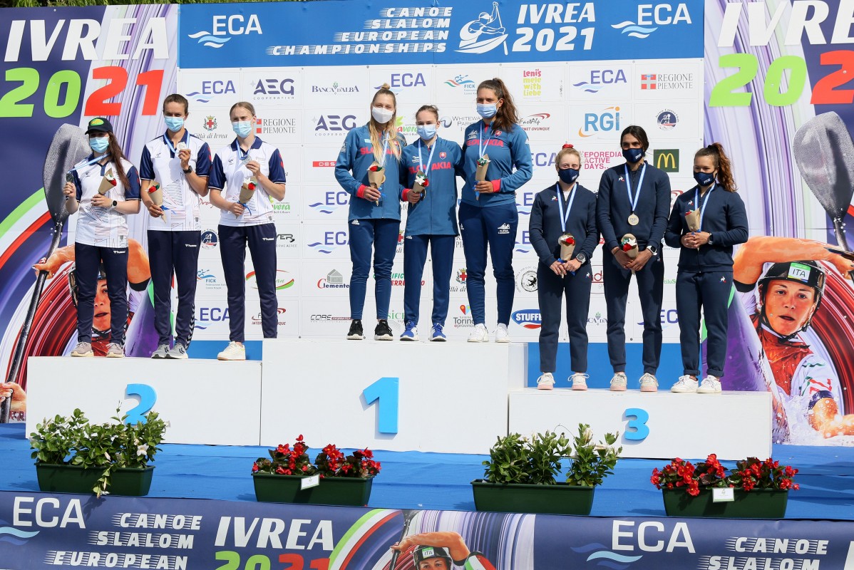 The first team event of the Championships - women's kayak race - brought the first medal for Great Britain. Kimberley Woods, Fiona Pennie and Mallory Franklin made an impressive run to win gold medal at the 2021 ECA Canoe Slalom European Championships on the Dora Baltea River. It was a dream come back after British team missed out last year's European Championships in Prague due to Covid-19. The British trio was more than two seconds faster than Austrians Corinna Kuhnle, Viktoria Wolffhardt and Antonia Oschmautz, while Czech team with Katerina Minarik Kudejova, Veronika Vojtova and Antonie Galuškova finished third.