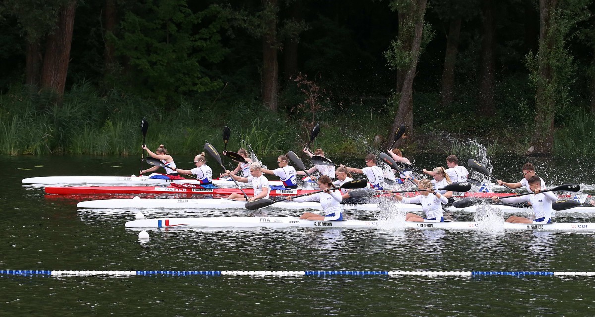 The first day of the canoe sprint finals at the EYOF in Hungary brought celebration of eight teams whose athletes won medals today in the 500 metres A finals in K1M, K1W, C1M, C1W, K2M, K2W, C2 mix and K4 mix events. German team was the most successful with three gold and two silver medals. In a total medal count the host nation – Hungary – picked up the most medals, six altogether: two gold, three silver and a bronze. Belarus, Russia and Spain each won one gold medal, Belarus also two bronze medals and Russia one silver. Slovakia finished the day with two silver and one bronze medal, Czech Republic celebrated three bronze medals, while Denmark won one bronze medal.