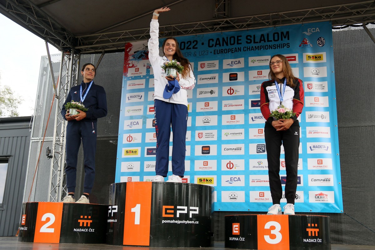 The host nation celebrated two gold medals on the third competition day of the 2022 ECA Junior and U23 Canoe Slalom European Championships on the Vltava River, when the first medals in the individual events were awarded.